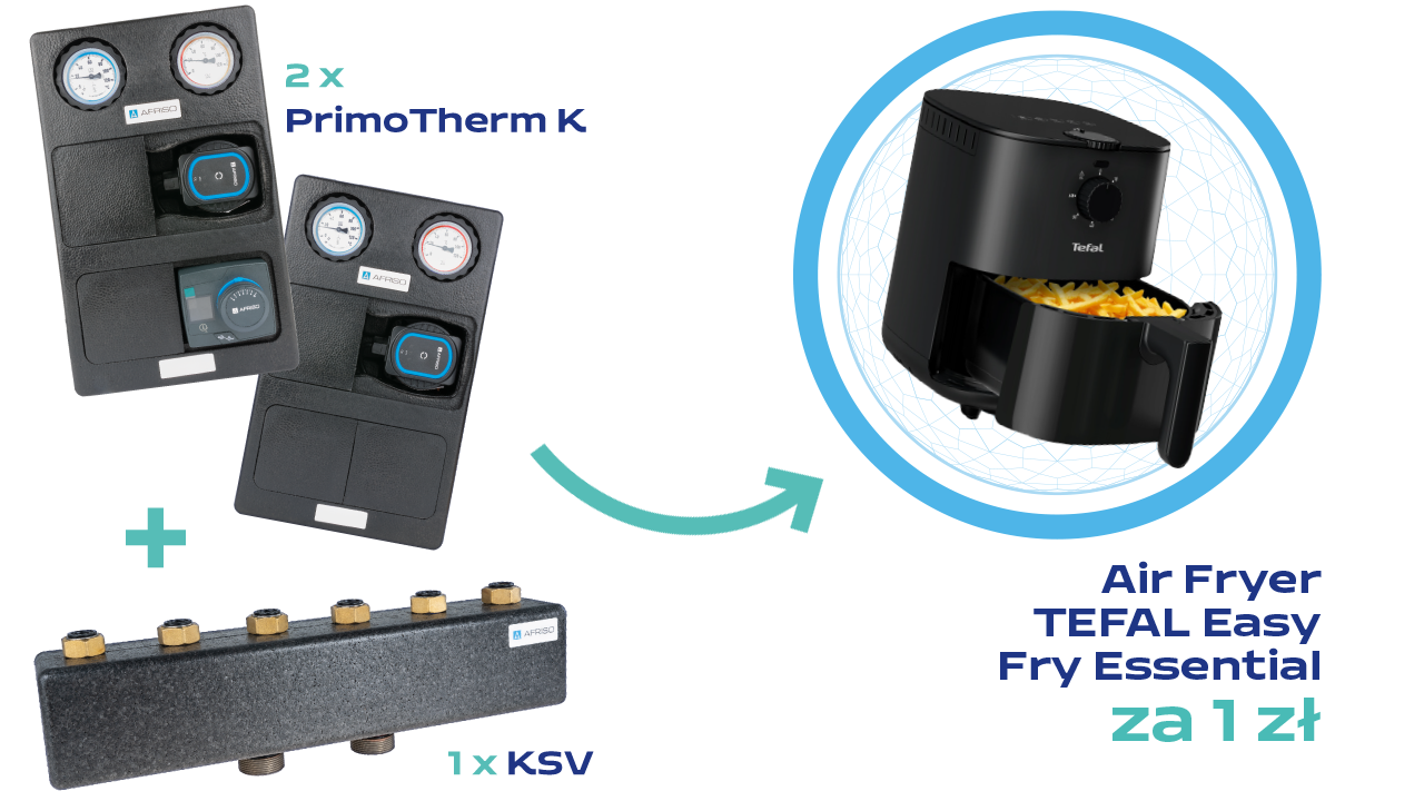 Przy zakupie dwóch dowolnych grup pompowych PrimoTherm K oraz rozdzielacza KSV lub sprzęgła hydraulicznego, otrzymasz AirFryer TEFAL za symboliczną złotówkę.